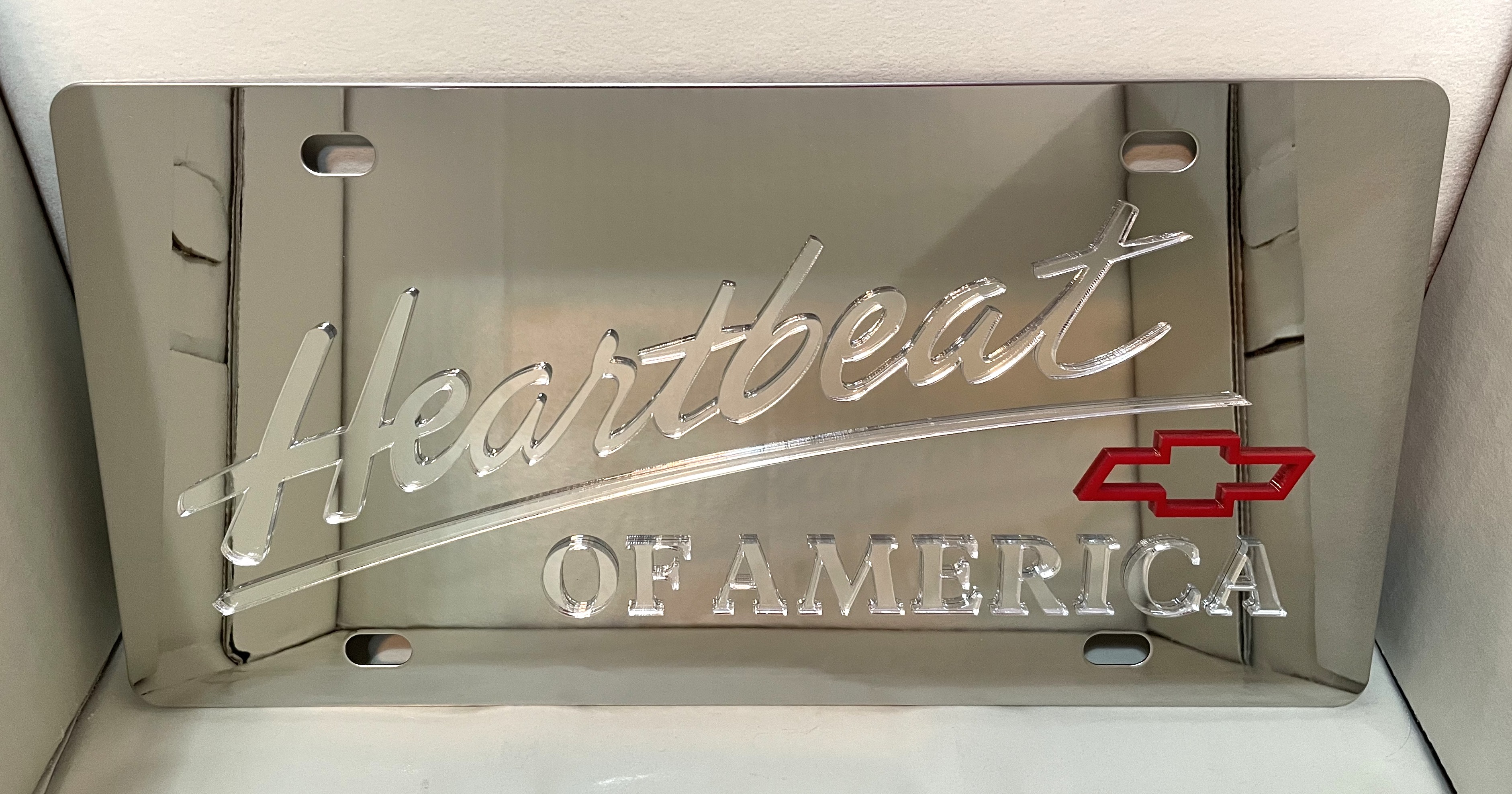Chevrolet Heartbeat of America mirror vanity license plate car tag. Stainless steel plate with chrome mirror finish using .125 thick laser cut acrylic to form the emblem and/or lettering. Made in the USA.